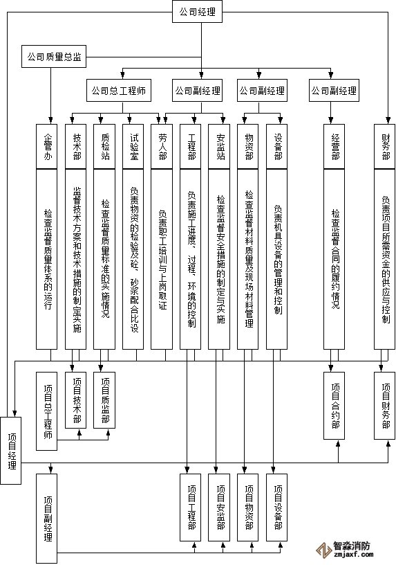 2.1按貫標(biāo)認(rèn)證的要求組成項目經(jīng)理部,健全完善的質(zhì)量體系,根據(jù)ISO9001:2000國際標(biāo)準(zhǔn)要求,組建工程項目經(jīng)理部,項目經(jīng)理部設(shè)項目經(jīng)理、技術(shù)負(fù)責(zé)人及四部一室(材料設(shè)備部、技術(shù)質(zhì)安部、生產(chǎn)經(jīng)營部、財務(wù)勞資部、綜合辦公室),項目經(jīng)理代表我方對項目全面負(fù)責(zé),是工程質(zhì)量的第一負(fù)責(zé)人,在項目上實施制定的質(zhì)量方針和“質(zhì)量、工期、服務(wù)”的企業(yè)宗旨,全面履行工程合同。技術(shù)負(fù)責(zé)人對項目經(jīng)理負(fù)責(zé),協(xié)助項目經(jīng)理監(jiān)督管理項目質(zhì)量體系的運行,