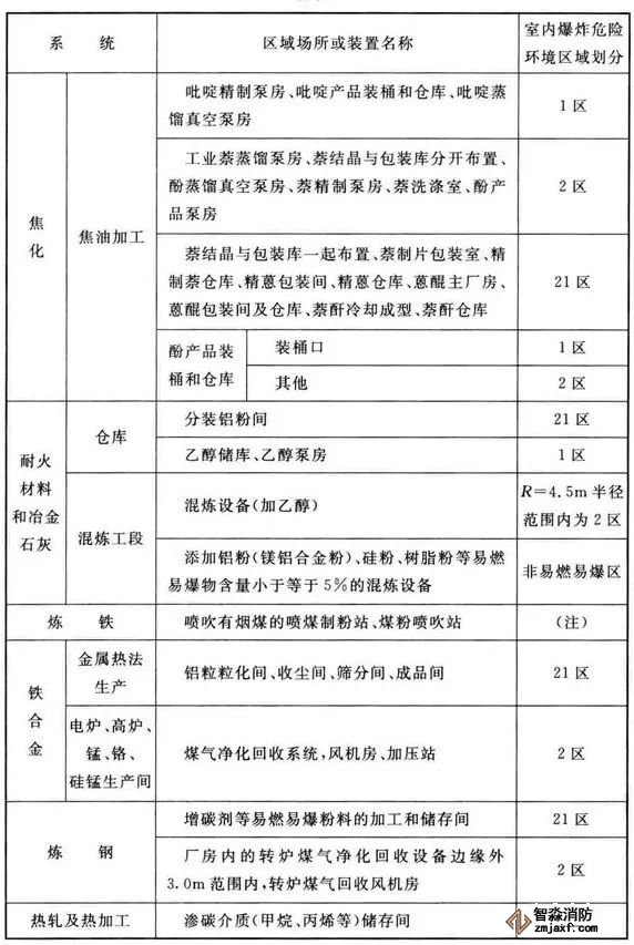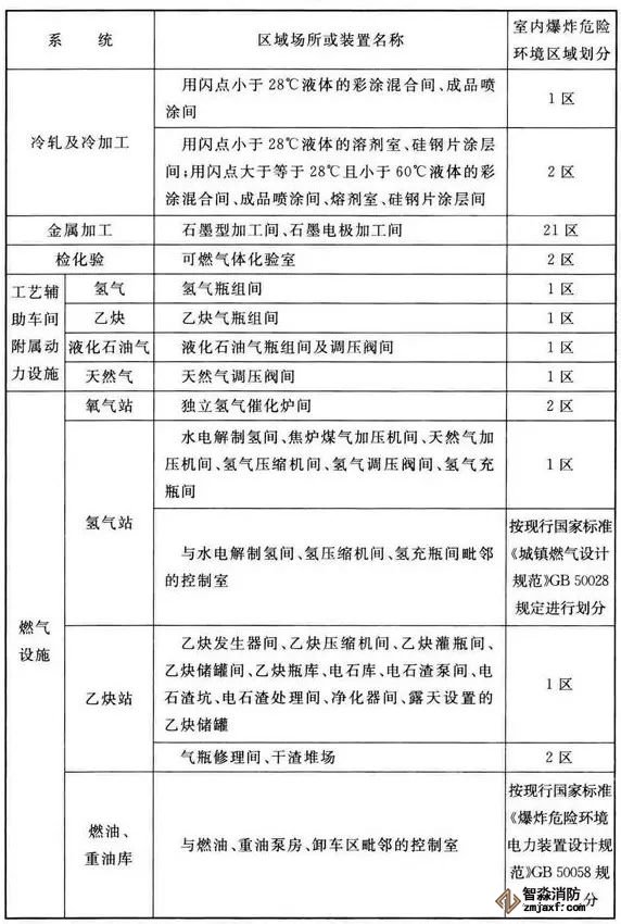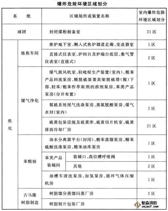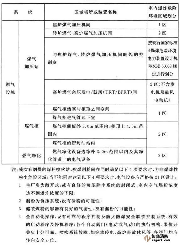3、可能散發(fā)可燃?xì)怏w、可燃蒸氣的煤氣凈化系統(tǒng)的鼓冷、脫硫、粗苯、油庫(kù),苯精制,焦?fàn)t地下室,煤氣燒嘴操作平臺(tái)等工藝裝置區(qū)和儲(chǔ)運(yùn)區(qū)等,在其爆炸危險(xiǎn)環(huán)境2區(qū)內(nèi)以及附加2區(qū)內(nèi)(具體如下表爆炸危險(xiǎn)環(huán)境區(qū)域劃分),應(yīng)設(shè)置可燃?xì)怏w探測(cè)報(bào)警系統(tǒng)。