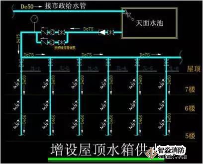 當市政管網(wǎng)的供水壓力夠大(能夠到達最高樓層)但是管徑偏?。ㄐ∮贒e50)時,則可在樓頂增設(shè)屋頂冷水箱,市政管網(wǎng)接入屋頂冷水箱進行蓄水,在供水的主管道上安裝增壓水泵和變頻控制器,壓力控制以滿足最高樓層的供水壓力不小0.15MPa為準。