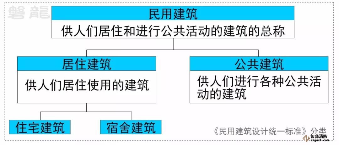注:考慮宿舍、公寓等非住宅類(lèi)居住建筑的火災(zāi)危險(xiǎn)性與公共建筑接近,因此,《建筑設(shè)計(jì)防火規(guī)范》將民用建筑分為公共建筑和住宅建筑兩大類(lèi),詳見(jiàn)專(zhuān)題:民用建筑-建筑分類(lèi)!
