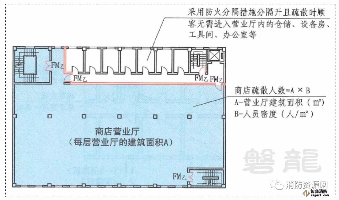注1:本條所指“營業(yè)廳的建筑面積”,既包括營業(yè)廳內(nèi)展示貨架、柜臺、走道等顧客參與購物的場所,也包括營業(yè)廳內(nèi)的衛(wèi)生間、樓梯間、自動扶梯等的建筑面積。對于進行了嚴(yán)格的防火分隔,并且疏散時無需進入營業(yè)廳內(nèi)的倉儲、設(shè)備房、工具間、辦公室等,可不計入營業(yè)廳的建筑面積。