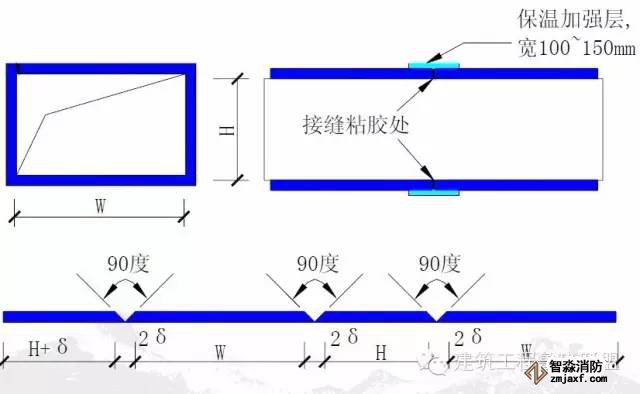 3、方形風管保溫900轉(zhuǎn)角 處采用45度拼裝,保溫板 裁900角時不要割透,預留 5mm厚作為整體轉(zhuǎn)角用, 然后用膠水進行拼縫。