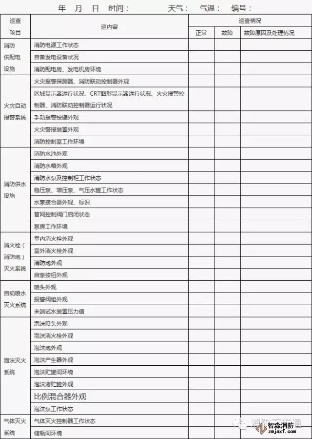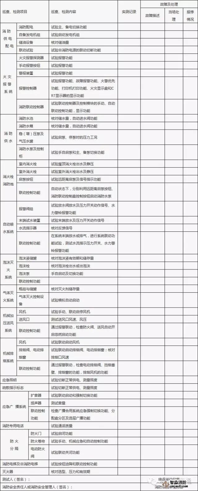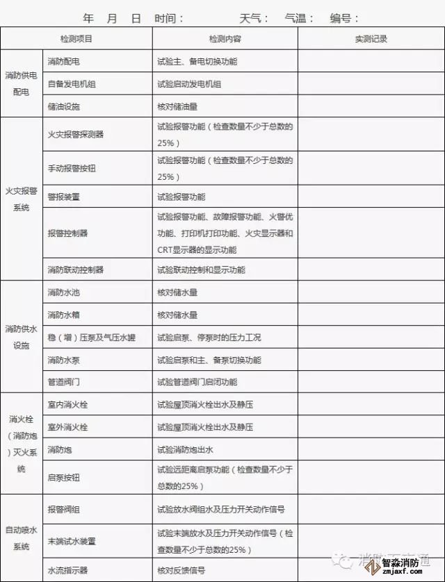 3、發(fā)現(xiàn)的問題或存在故障在“實(shí)測記錄”欄中填寫,并及時(shí)處置;當(dāng)場不能處置的要填報(bào)《建筑消防設(shè)施故障處理記錄》。
