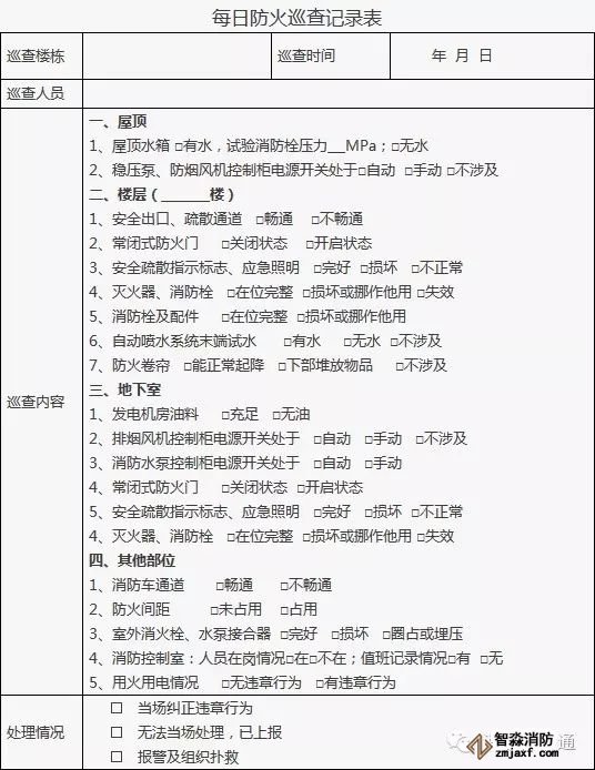 3、對發(fā)現(xiàn)的問題應(yīng)及時(shí)處理,當(dāng)場不能處置的要填報(bào)《建筑消防設(shè)施故障處理記錄》。