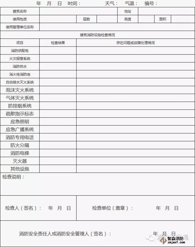 2、檢查發(fā)現(xiàn)建筑消防設(shè)施存在問題和故障的,實(shí)施檢查的人員必須向單位消防安全管理人報(bào)告,并填表。
