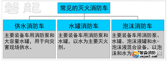 滅火消防車主要裝備滅火裝置,用于撲滅各類火災(zāi),主要分為14類:水罐消防車、供水消防車、泡沫消防車、干粉消防車、干粉泡沫聯(lián)用消防車、干粉水聯(lián)用消防車、氣體消防車、壓縮空氣泡沫消防車、泵浦消防車、高倍泡沫消防車、水霧消防車、高壓射流消防車、機場消防車、渦噴消防車等。其中,常見的主要有水罐消防車、供水消防車、泡沫消防車等。