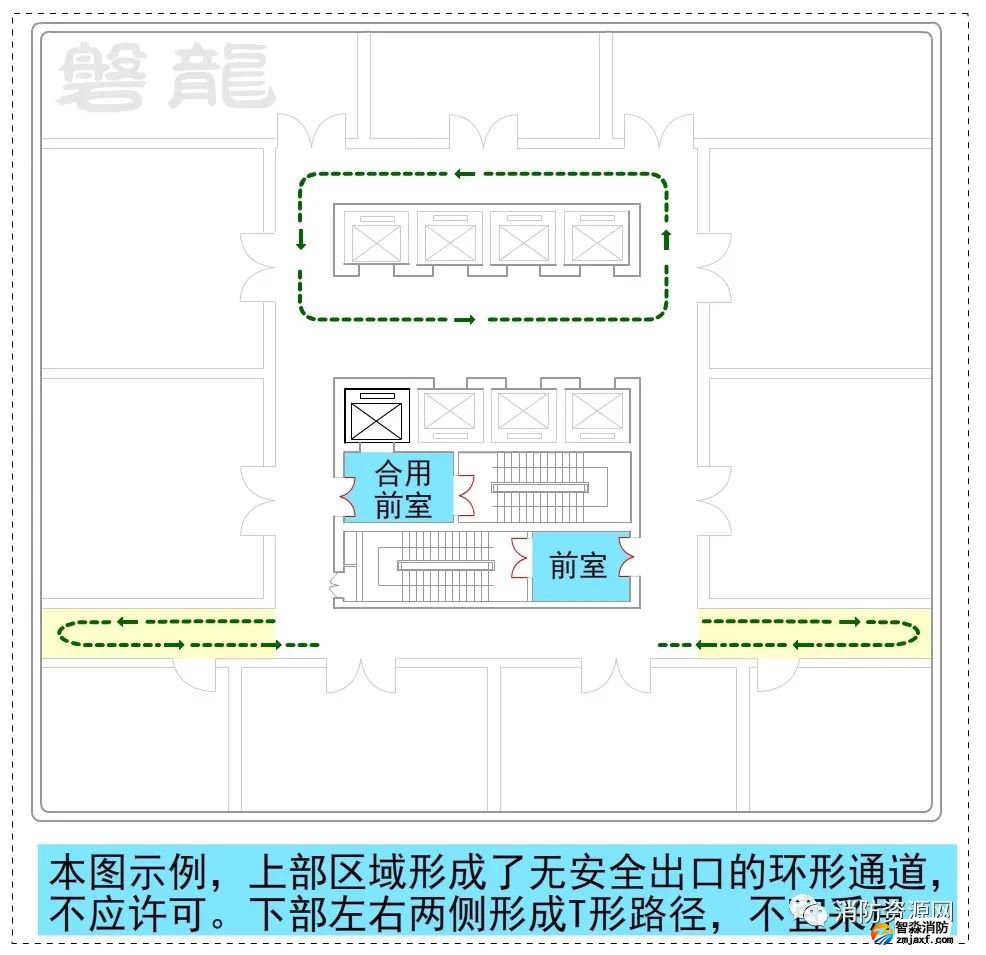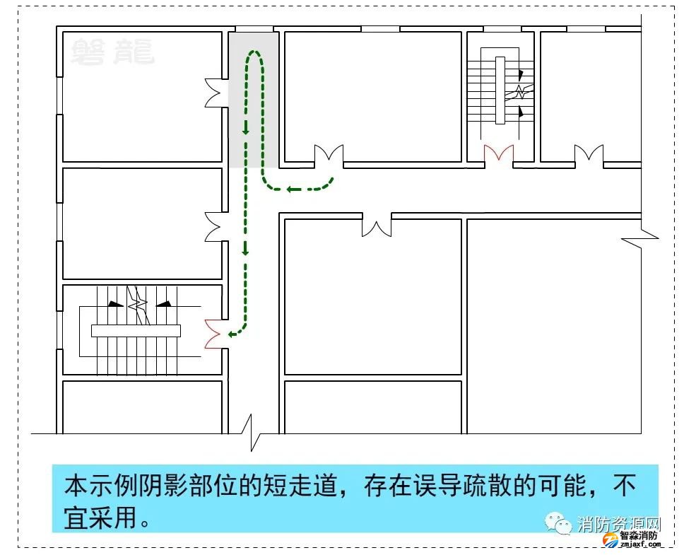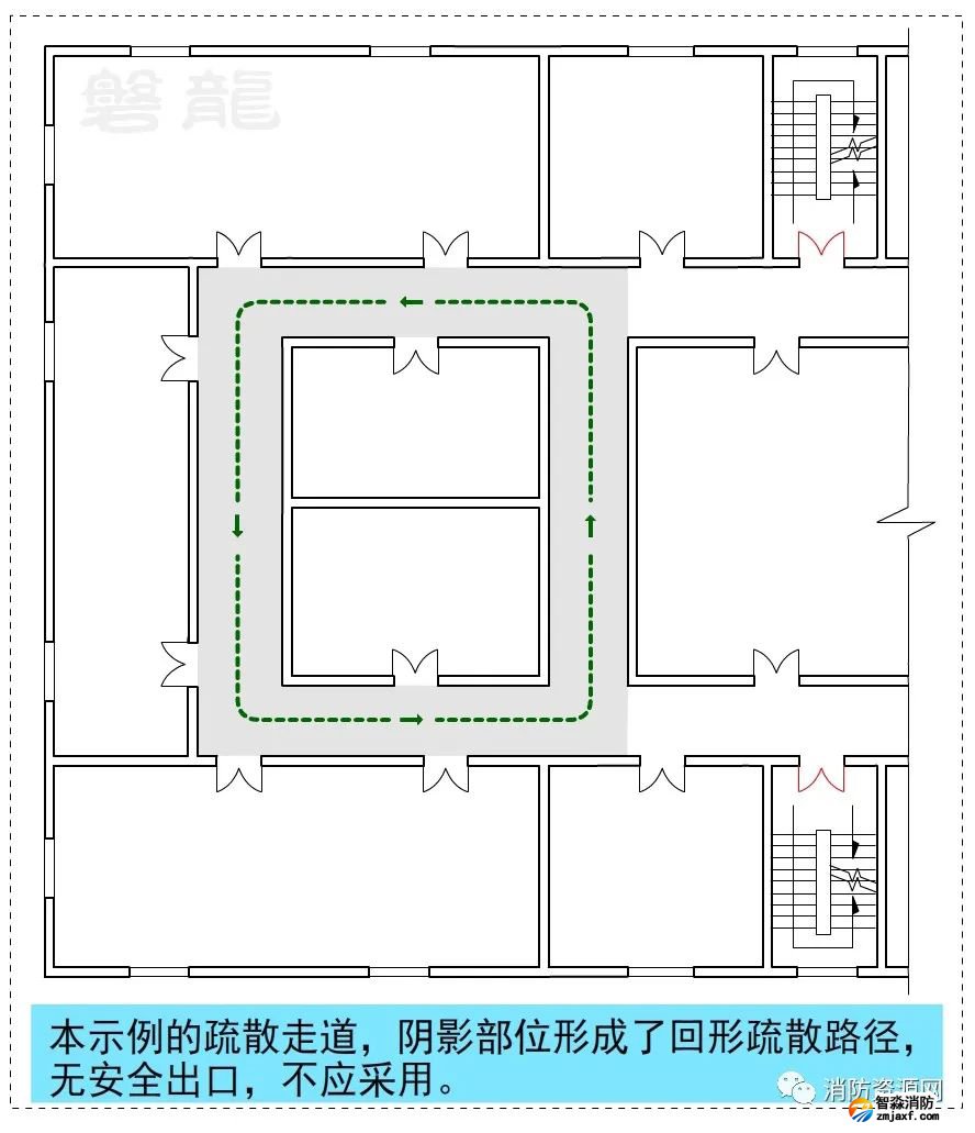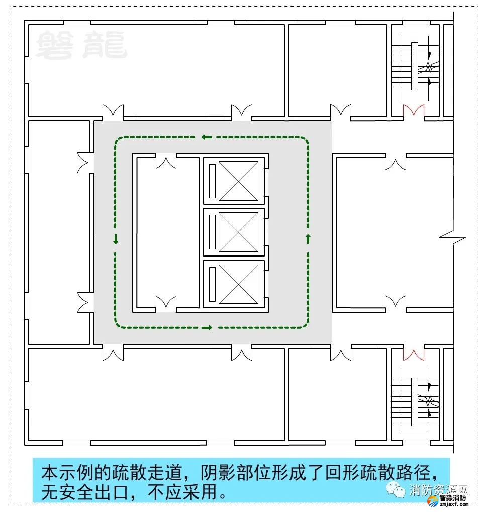 1、圖示9、圖示10所示的疏散走道,示例部位形成環(huán)形疏散路徑,沒(méi)有安全出口,不應(yīng)采用。