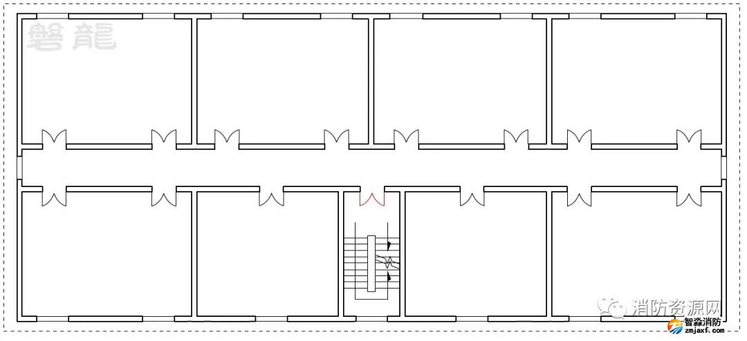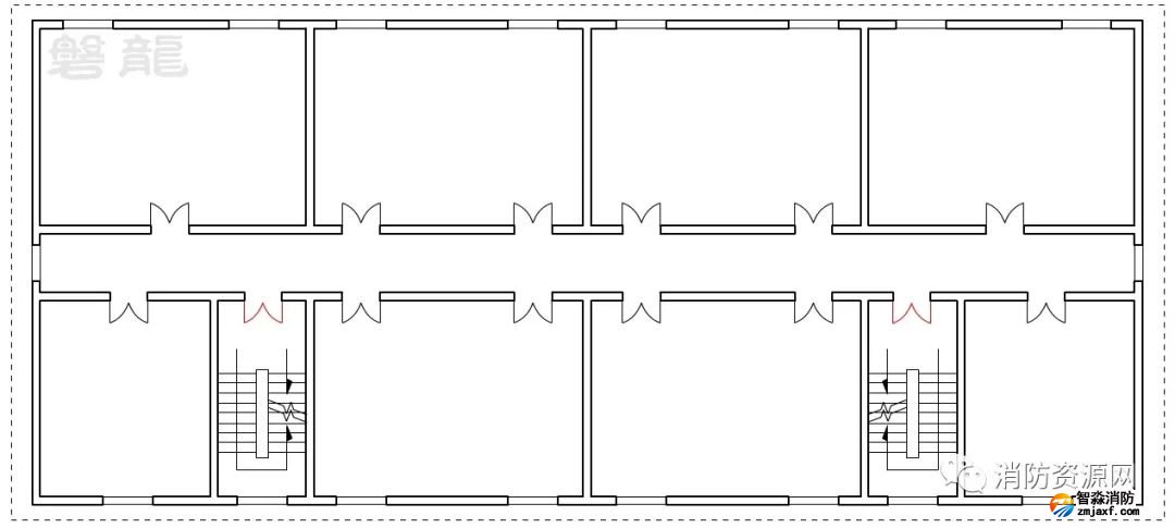 二、圖示2的疏散走道,僅設(shè)置有一個(gè)疏散樓梯,疏散走道的所有疏散門(mén)均為單向疏散,整個(gè)疏散走道均應(yīng)視為單向疏散走道,即袋形走道: