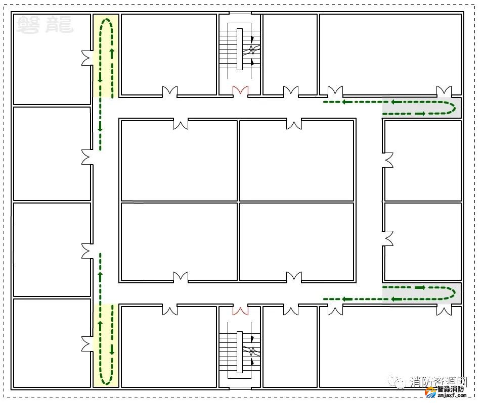 2、圖示12的方案,左側(cè)區(qū)域的T形路徑出來(lái)以后,沒(méi)有直達(dá)安全出口,不宜采用,右側(cè)區(qū)域的T形路徑應(yīng)嚴(yán)格控制疏散距離。