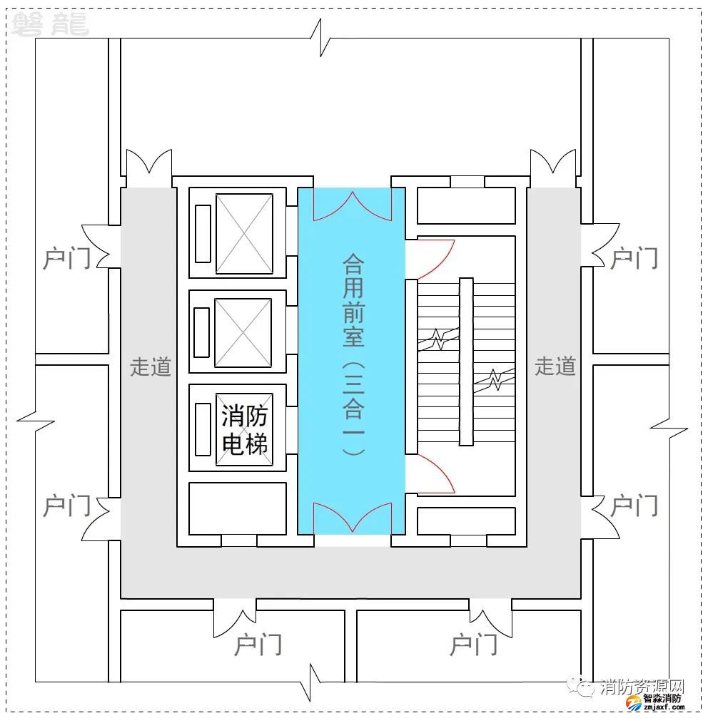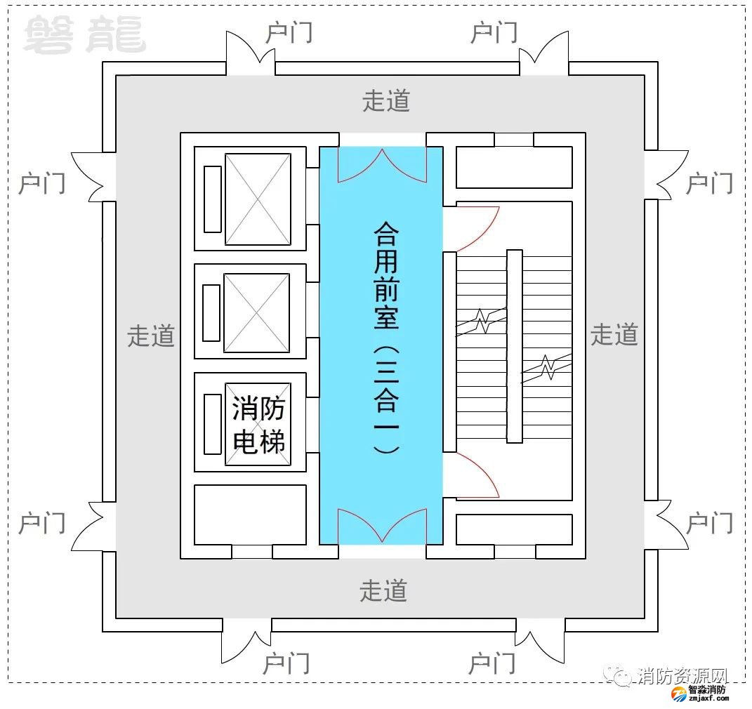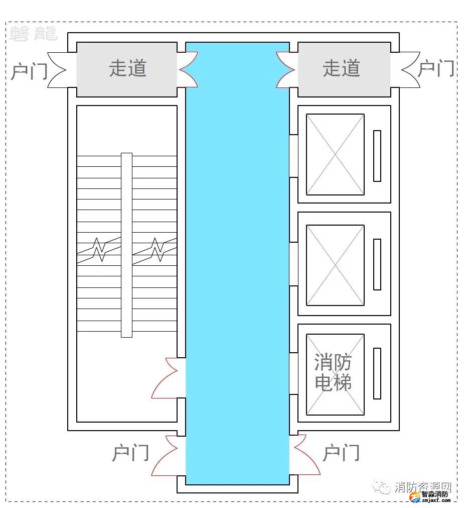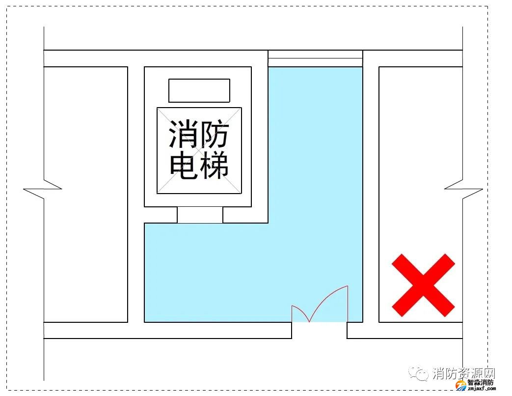 三、公共建筑人員較為繁雜,穿套前室會(huì)直接影響消防電梯前室的封閉性能,且人員不一定熟悉現(xiàn)場(chǎng)環(huán)境,封閉的消防電梯前室門可能導(dǎo)致疏散盲區(qū),因此,公共建筑不應(yīng)許可穿套消防電梯前室。