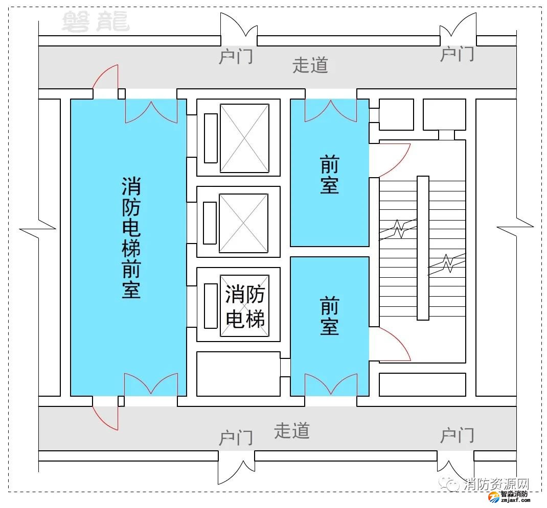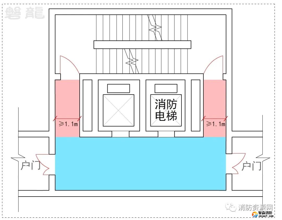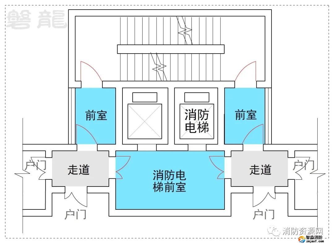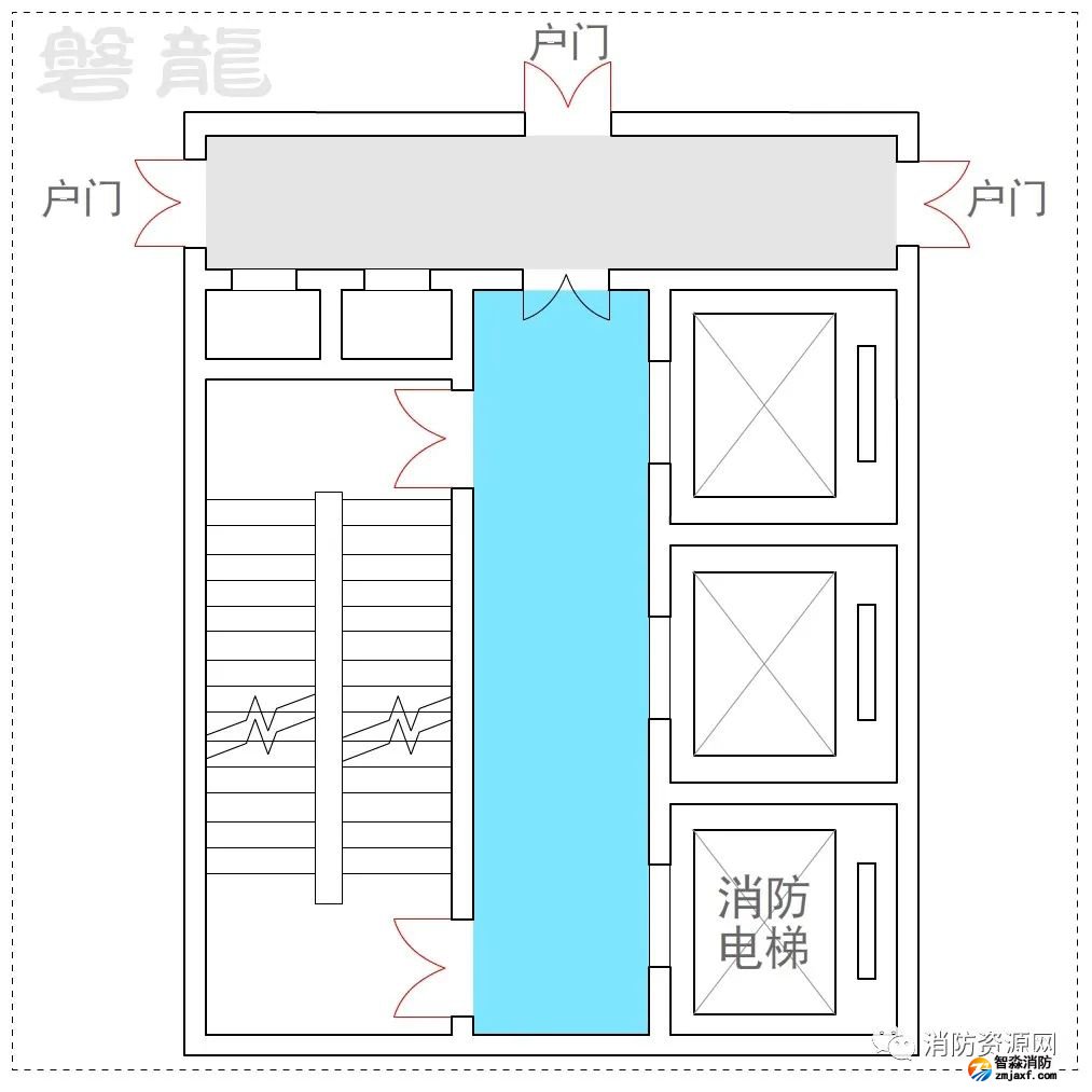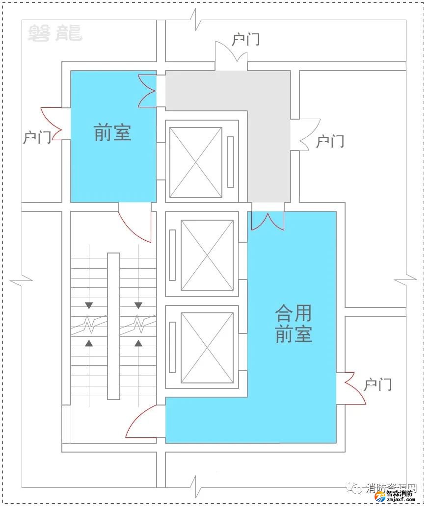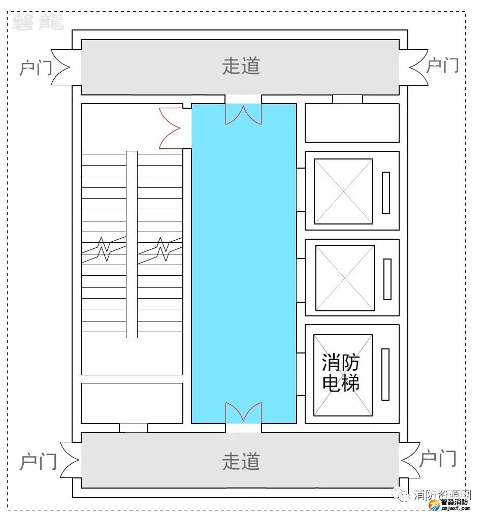 2、許可示例(示例27):本示例中,戶門直接對(duì)消防電梯前室開放,也通常認(rèn)為可行:(有爭(zhēng)議)