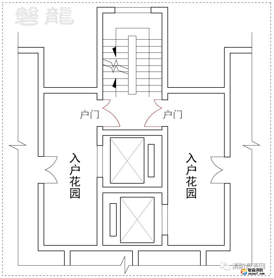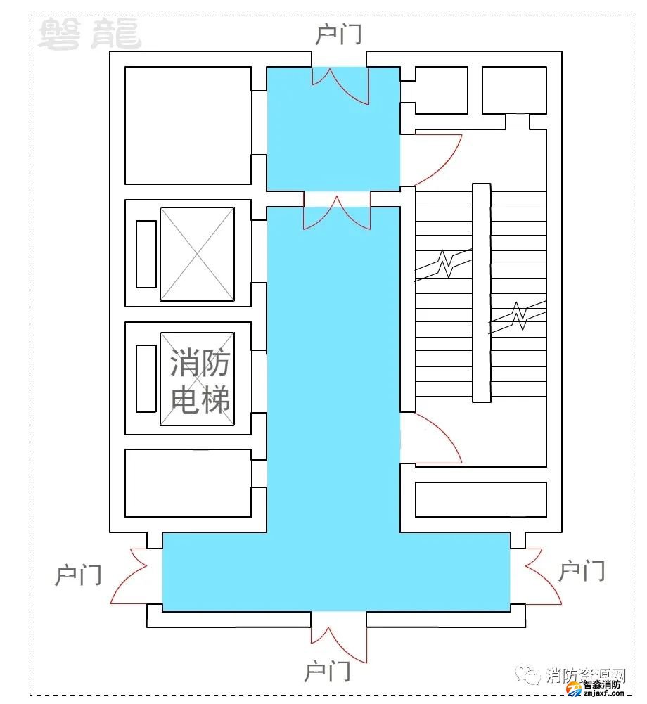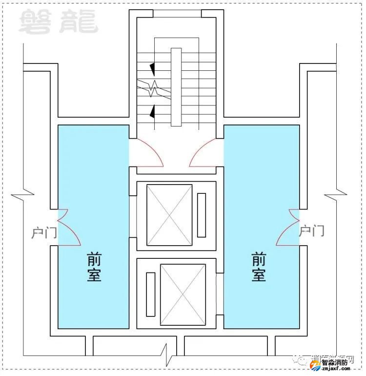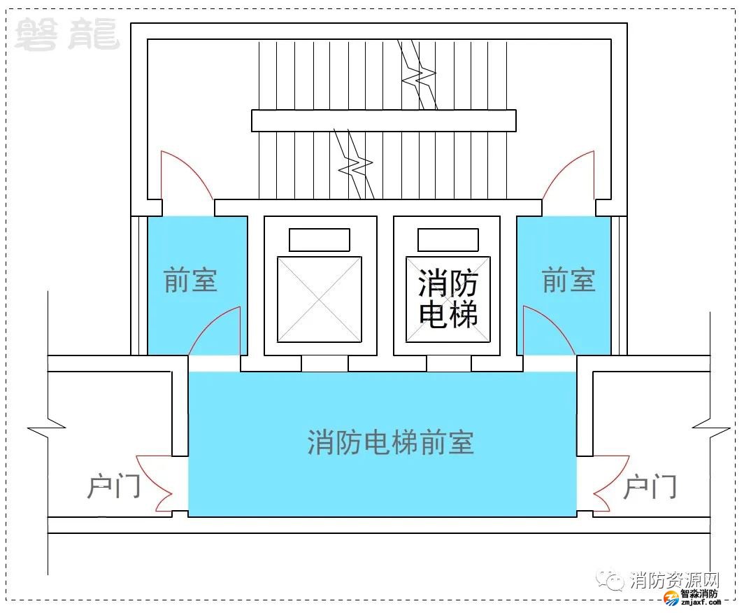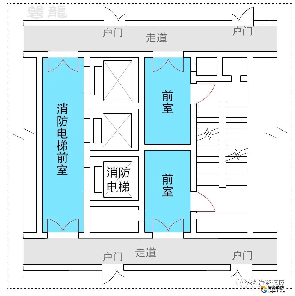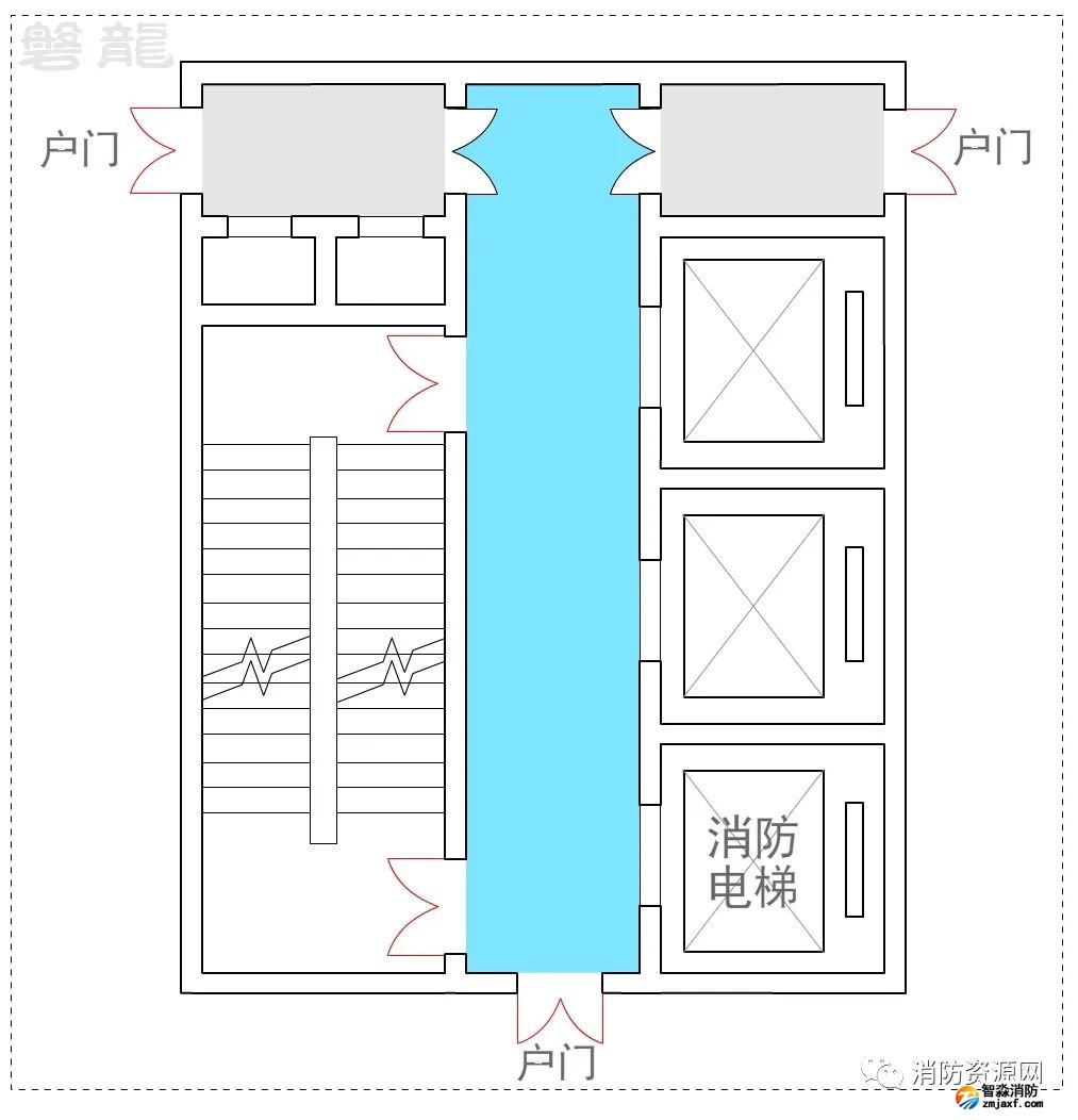 2、許可示例(示例27):本示例中,戶門直接對(duì)消防電梯前室開放,也通常認(rèn)為可行:(有爭(zhēng)議)