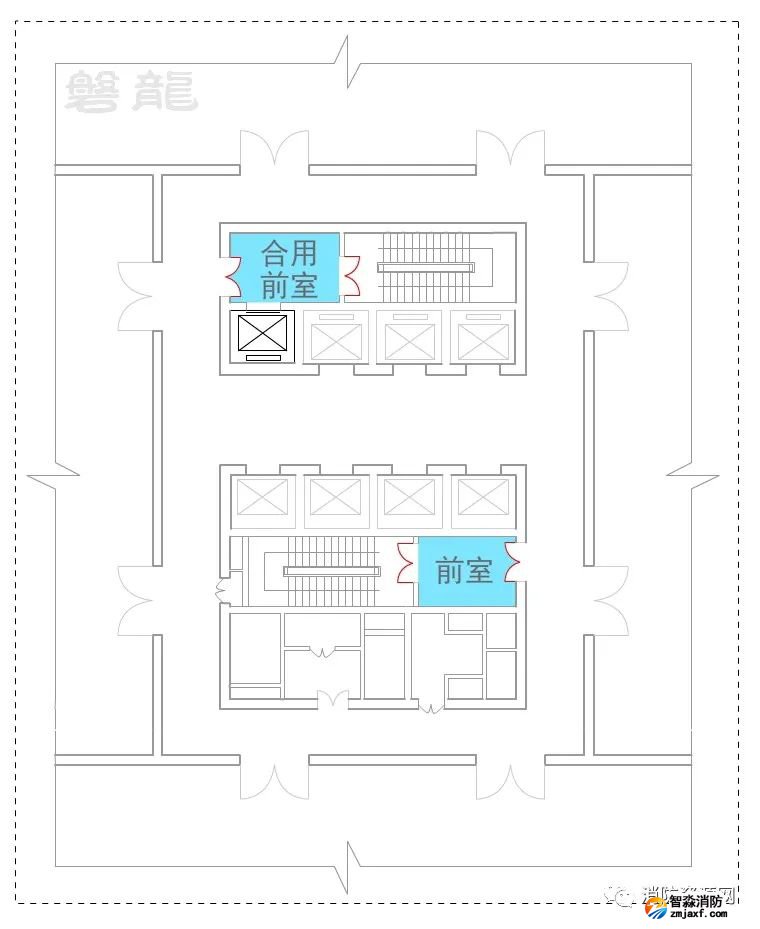以此為原則,除非是“兩個(gè)疏散樓梯共用前室”的情況,其他前室均應(yīng)視為只具備一個(gè)安全出口。也就是說(shuō),凡戶門對(duì)樓梯間獨(dú)立前室(或合用前室)開放的情況,均只能視為一個(gè)安全出口。這是基本規(guī)則,否則必將衍生極端方案,規(guī)范條文形同虛設(shè)。