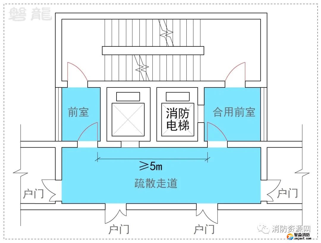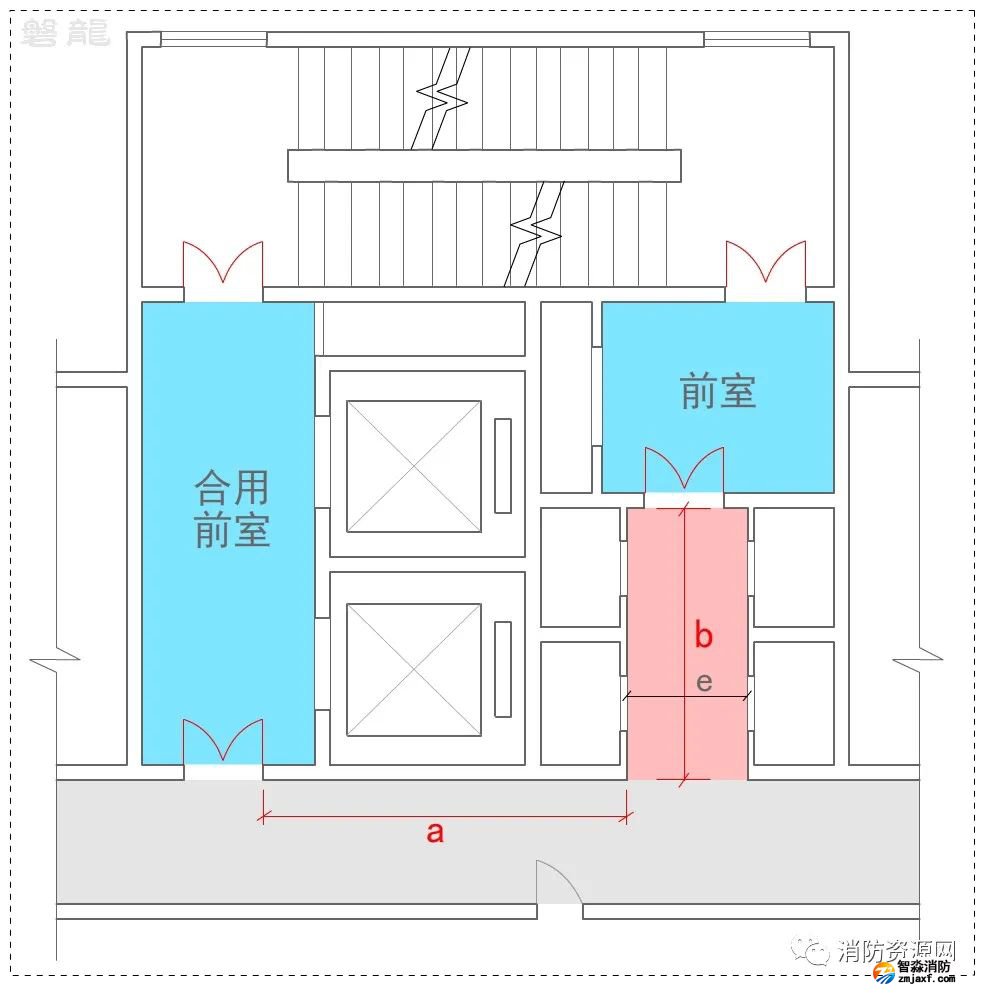 前室應(yīng)該是相對(duì)規(guī)則的區(qū)域,特殊情況下,可以有不規(guī)則的擴(kuò)展部分,但應(yīng)確保消防電梯前室規(guī)則區(qū)域的尺寸及面積要求,有疏散功能的通道,其凈寬度應(yīng)計(jì)算確定,并不應(yīng)小于對(duì)應(yīng)建筑內(nèi)疏散走道的最小凈寬度要求。