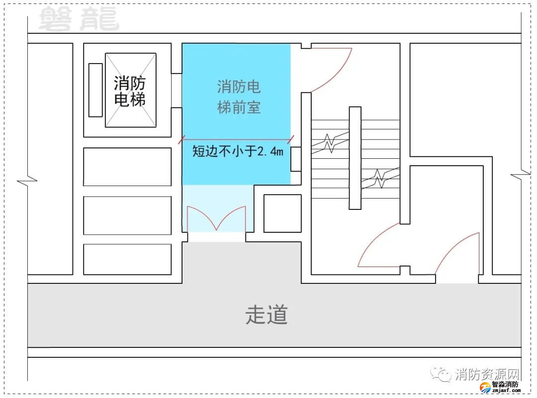 消防電梯前室的短邊不應(yīng)小于2.4m,主要是為了滿足消防員整裝和擔(dān)架運(yùn)輸?shù)裙δ芤?,前室的面積和尺寸應(yīng)是與消防電梯門正對(duì)的規(guī)則區(qū)域,不應(yīng)通過(guò)過(guò)道、拐角等擴(kuò)展區(qū)域來(lái)實(shí)現(xiàn)。