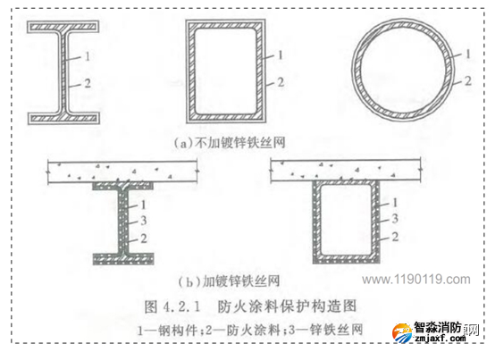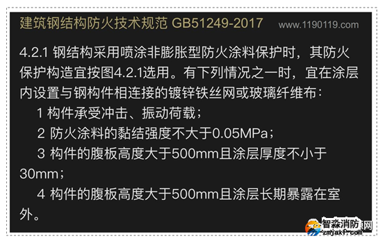 1、根據(jù)《建筑鋼結(jié)構(gòu)防火技術(shù)規(guī)范》4.2.1執(zhí)規(guī)定,部分涂層內(nèi)應(yīng)設(shè)置與鋼構(gòu)件相連接的鍍鋅鐵絲網(wǎng)或玻璃纖維布: