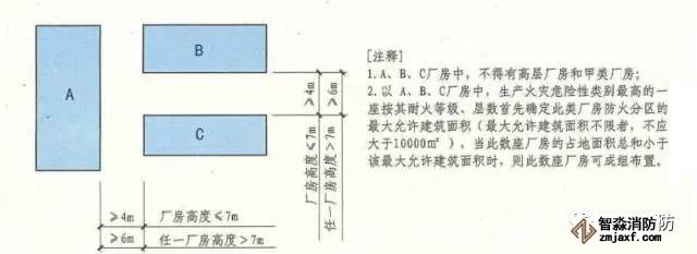 除高層廠房和甲類廠房外,其他類別的數(shù)座廠房占地面積之和小于本規(guī)范第3.3.1條規(guī)定的防火分區(qū)最大允許建筑面積(按其中較小者確定,但防火分區(qū)的最大允許建筑面積不限者,不應(yīng)大于10000㎡)時,可成組布置。當廠房建筑高度不大于7m時,組內(nèi)廠房之間的防火間距不應(yīng)小于4m;當廠房建筑高度大于7m時,組內(nèi)廠房之間的防火間距不應(yīng)小于6m。