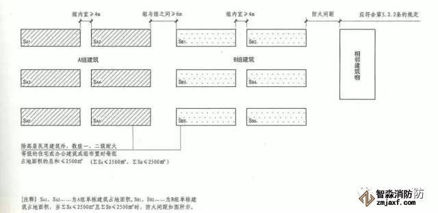 除高層民用建筑外,數(shù)座一、二級耐火等級的住宅建筑或辦公建筑,當建筑物的占地面積總和不大于2500㎡時,可成組布置,但組內(nèi)建筑物之間的間距不宜小于4m。組與組或組與相鄰建筑物的防火間距不應(yīng)小于本規(guī)范第5.2.2條的規(guī)定。