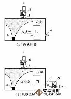 1,5-火源;2,6-排煙風(fēng)機;3,7-排煙口;4,8-進(送)風(fēng)口;9-通風(fēng)機