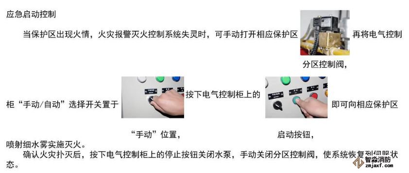當(dāng)保護(hù)區(qū)出現(xiàn)火情,火災(zāi)報警滅火控制系統(tǒng)失靈時,可手動打開相應(yīng)保護(hù)區(qū)分區(qū)控制閥,再將電氣控制柜“手動/自動”選擇開關(guān)置于“手動”位置,按下電氣控制柜上的啟動按鈕,即可向相應(yīng)保護(hù)區(qū)噴射細(xì)水霧實(shí)施滅火。