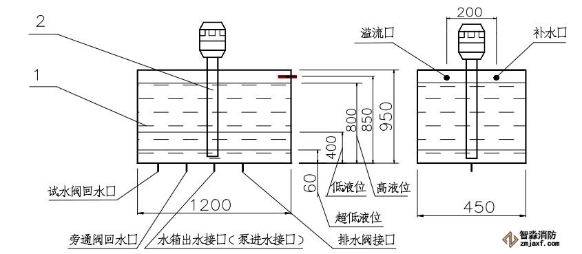 儲水箱在使用過程中,一是要確保向水箱注水時里面氣體順利排出,二是防止儲水箱里面水過滿,所以結(jié)合實(shí)際需要在儲水箱一側(cè)設(shè)置一滿液位溢水閥。