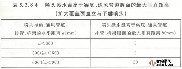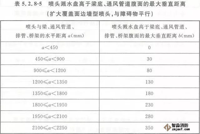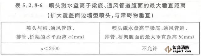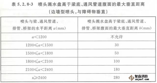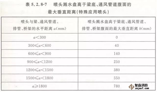5.2.8 當噴頭濺水盤高于附近梁底或高于寬度小于1.2m的通風管道、排管、橋架腹面時,噴頭濺水盤高于梁底、通風管道、排管、橋架腹面的最大垂直距離應符合表5.2.8-1~表5.2.8-9的規(guī)定(見圖5.2.8)。