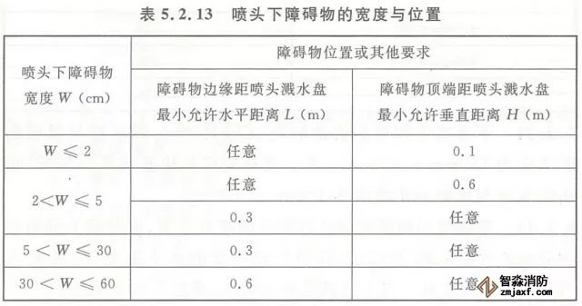 5.2.13 早期抑制快速響應(ESFR)噴頭與噴頭下障礙物的距離應滿足本規(guī)范圖5.2.12所示的要求。當無法滿足要求時,噴頭下障礙物的寬度與位置應滿足本規(guī)范表5.2.13的規(guī)定。