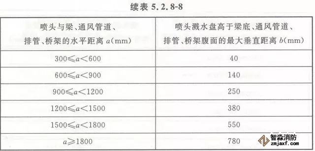 5.2.8 當(dāng)噴頭濺水盤高于附近梁底或高于寬度小于1.2m的通風(fēng)管道、排管、橋架腹面時(shí),噴頭濺水盤高于梁底、通風(fēng)管道、排管、橋架腹面的最大垂直距離應(yīng)符合表5.2.8-1~表5.2.8-9的規(guī)定(見圖5.2.8)。