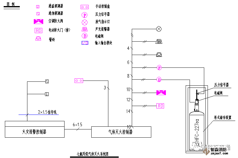 下面簡述一下該氣體滅火系統(tǒng)的組成方式,即參照《火災自動報警系統(tǒng)設計規(guī)范》GB50116-2013第4.4.3條,氣體滅火控制器、泡沫滅火控制器不直接連接火災探測器的組成方式,火災報警控制器設置在消防監(jiān)控中心,防護區(qū)設置的感煙探測器和感溫探測器直接連接到消防控制中心的集中報警控制器上,消防控制中心的火災報警控制器通過總線控制模塊聯(lián)動切除空調(diào)系統(tǒng)和防火閥,關閉防火卷簾門等;氣體滅火控制器設置在防護區(qū)的鋼瓶組附近,連接防護區(qū)內(nèi)的聲光報警器和防護區(qū)外的聲光報警器、以及啟動鋼瓶的電磁閥和氣體釋放的壓力開關信號機放氣指示門燈,現(xiàn)場緊急釋放和啟停按鈕設置在防護區(qū)門口。