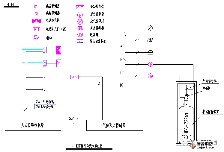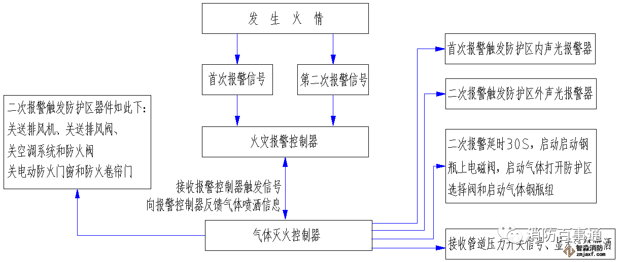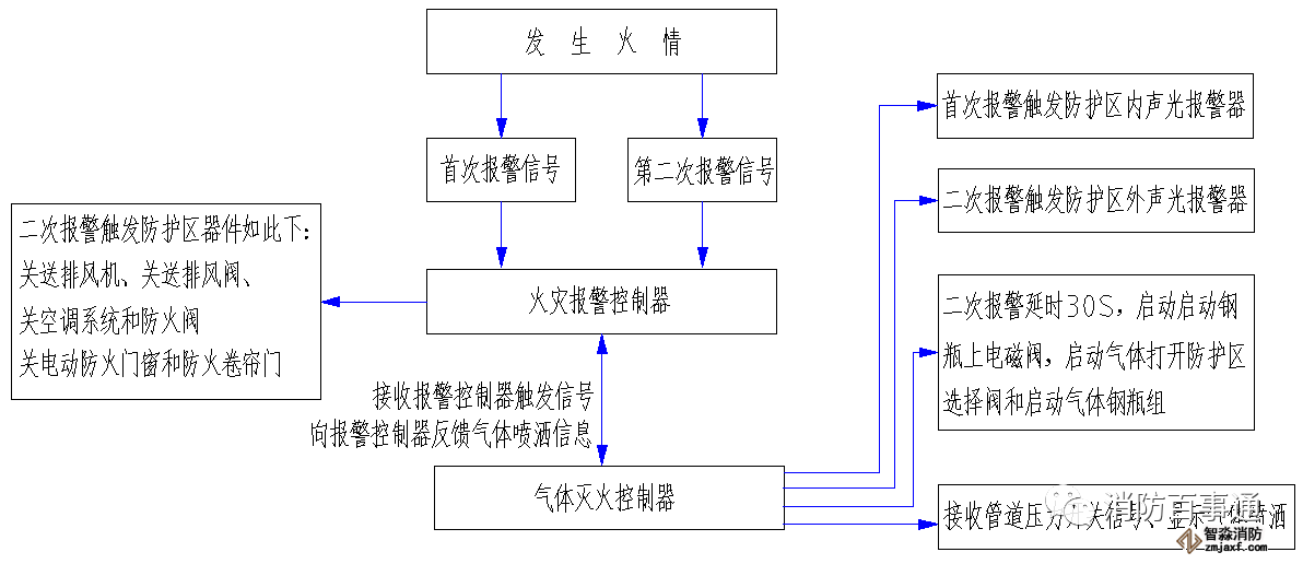 首先觸發(fā)信號防護區(qū)域內(nèi)任一設置的感煙火災探測器作為首個聯(lián)動觸發(fā)信號后,火災報警控制器接收到第一報警信號,同時氣體滅火控制盤接到火災報警控制器的聯(lián)動請求,啟動設置在該防護區(qū)內(nèi)的火災聲光警報器;再觸發(fā)感溫探測器或手動火災報警按鈕的報警信號,火災報警控制器接收到第二個報警信號,聯(lián)動該防護區(qū)內(nèi)的相關設備如:停止排風機、關閉排風閥、關閉空調(diào)電源和送風管道上的防火閥,關閉防火門窗和降下防火卷簾門;同時氣體滅火控制盤接到火災報警控制器的第二次聯(lián)動請求,啟動設置在該防護區(qū)外的火災聲光警報器;延時30秒后,開啟氣體啟動鋼瓶上的電磁閥,啟動氣體通過傳動管開啟相關區(qū)域的選擇閥和打開對應的FM200鋼瓶組,氣體噴灑到該保護區(qū)域,氣體傳送管道上的壓力開關有回答信號,同樣保護區(qū)外的“放氣勿入”指示燈點亮;氣體釋放的信息反饋到火災報警控制器上。